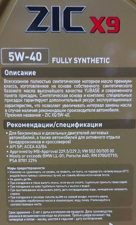 ZIC X9 SAE 5W40 1л SN/CF,A3/B3,A3/B4 (132613)